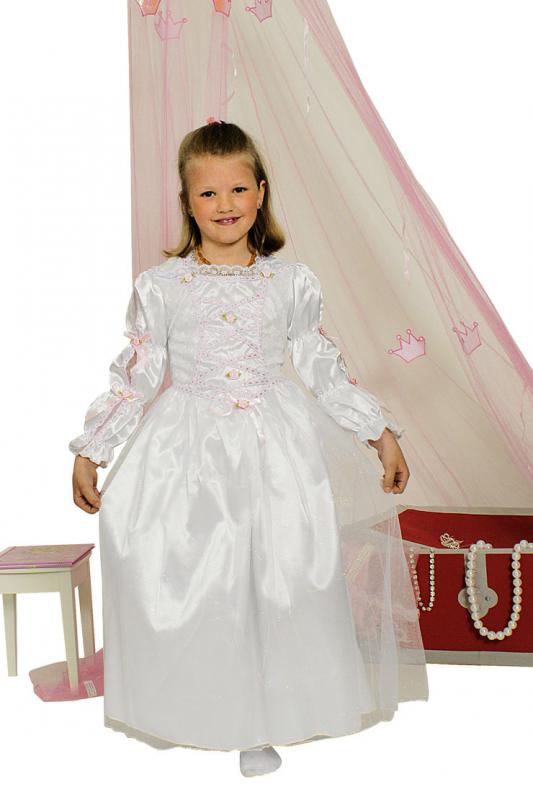 Langes Dornröschen-Kleid in weiß mit zauberhaften Verzierungen und kleinen Röschen in zartem Rose.