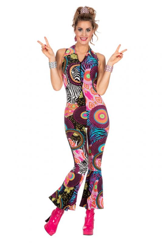 Der modische Overall aus leicht-fließendem, bunten Musterstoff ist aus einem super Material mit ausgestelltem Beinverlauf und Kragen.