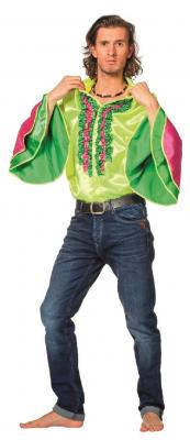 Das Hemd, in der Farbe neon-gelb besteht aus einem glänzenden Material und doppelt genähtem Kragen. Es ist besetzt mit länglichen Rüschen in den Farben grün und pink und einer Knopfleiste mit gelben Knöpfen. Weiter Ärmelabschluss ebenfalls in den Farben grün und pink.