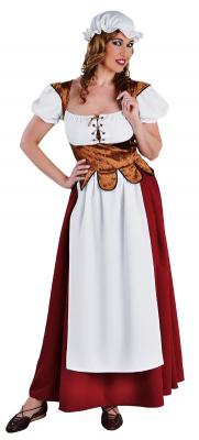 Die Magd, passend zu unserem Knecht, gestaltet sich wie folgt: Das lange Kleid aus hochwertiger Qualität, ist im Oberteil gefertigt wie eine Corsage mit eingesetzter Bluse und Puffärmel. Dazu gestaltet sich ein tolles Dekolletee. Das Oberteil, besteht aus braunem Pannesamt und aus einem festen, creme-farbenden Stoff mit brauner Schnürrung. Der lange, weite Rock trägt die Farbe wein-rot und ist versehen mit einer langen creme-farbenden Schürze.