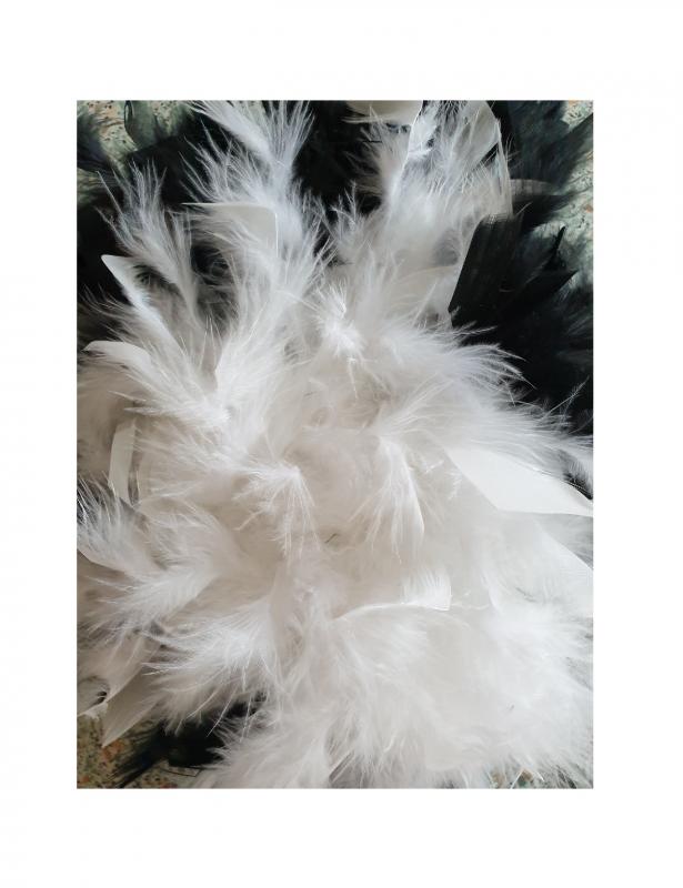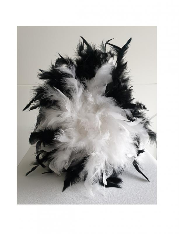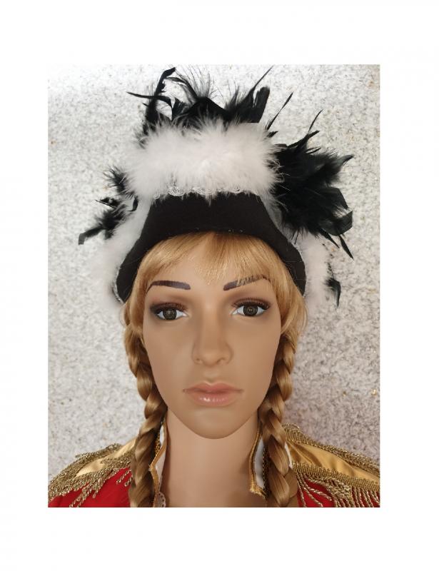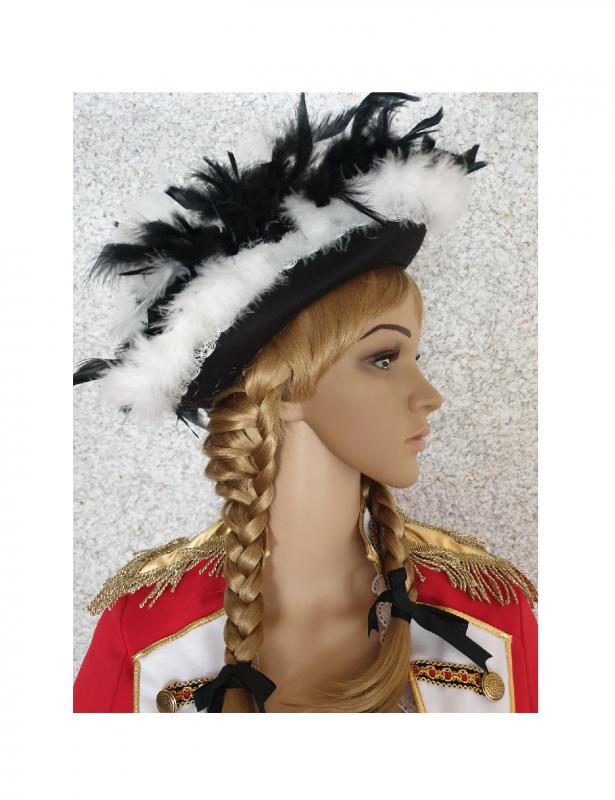 "Funkenhut schwarz mit Silberborte,Marabu weiß und schwarz-weißer Boa".