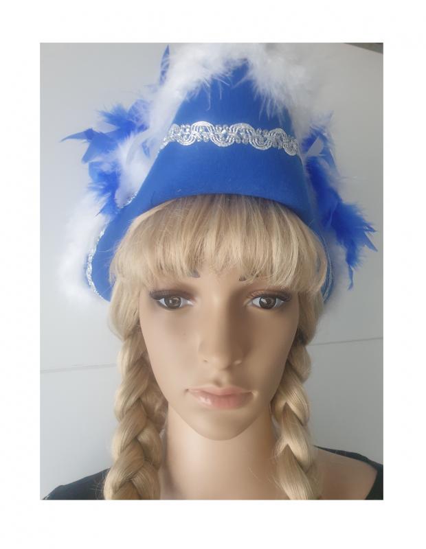 "Funkenhut blau mit Silberborte,Marabu weiß und blau-weißer Boa".