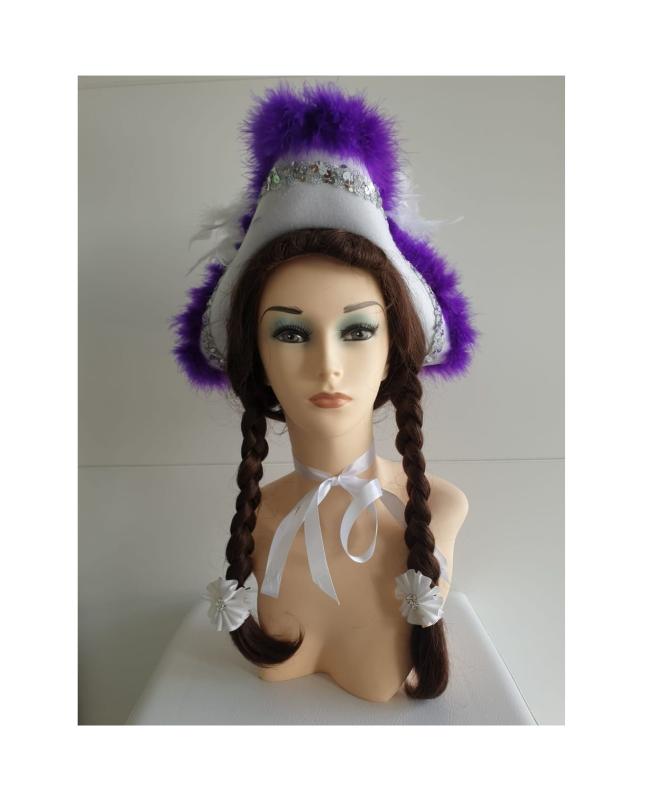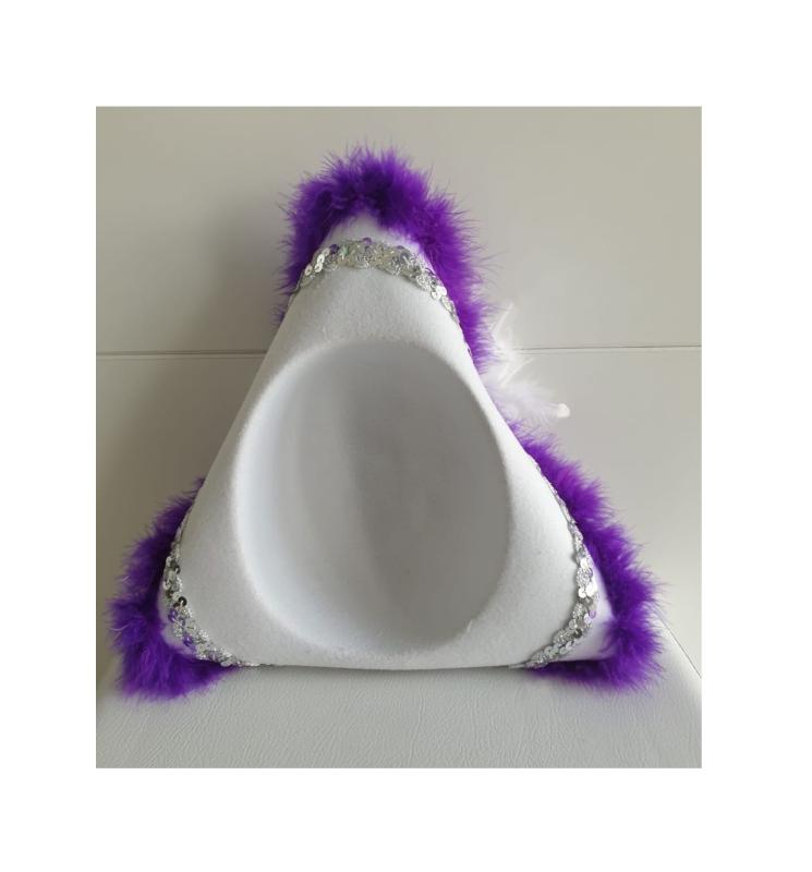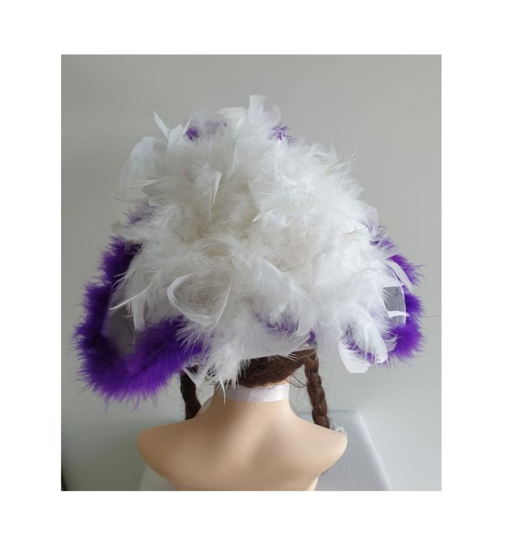 "Weißer Funkenhut mit silberborte ,lilaren Marabu und weißer Federboa".
