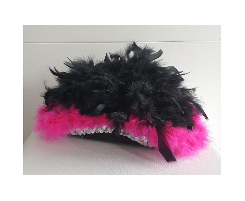 "Schwarzer Funkenhut mit silberborte , pinken Marabu und schwarzen Federboa".