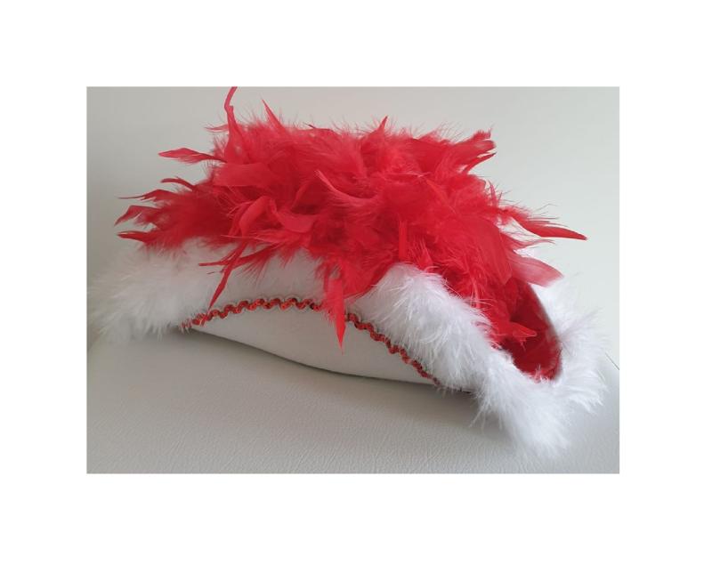 "Weißer Funkenhut mit rot-silberborte , weißen Marabu und roter Federboa".