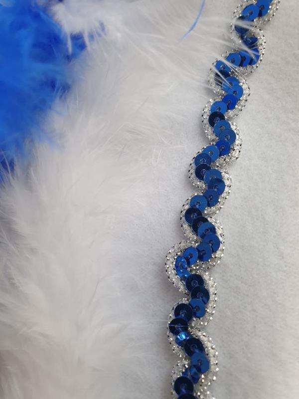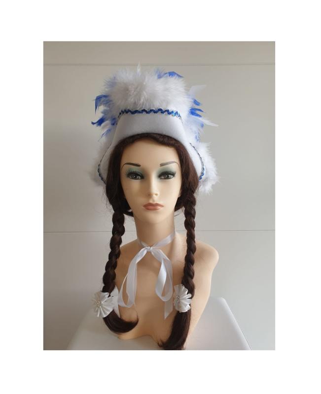 "Weißer Funkenhut mit blau-silberborte , weißen Marabu und blau-weiß-mix Federboa".
