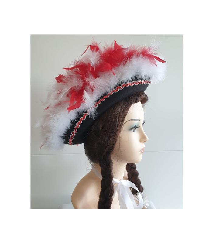 "Schwarzer Funkenhut mit rot-silberborte , weißen Marabu und Federboa rot-weiß-mix".