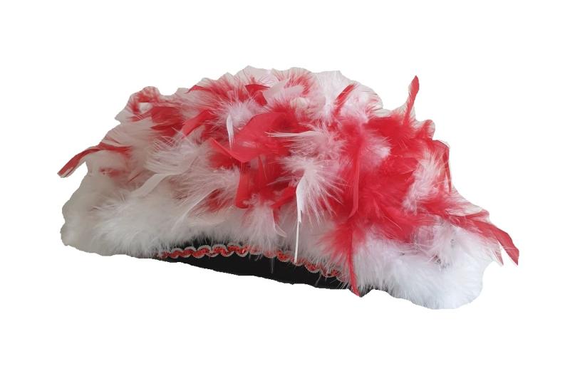 "Schwarzer Funkenhut mit rot-silberborte , weißen Marabu und Federboa rot-weiß-mix".