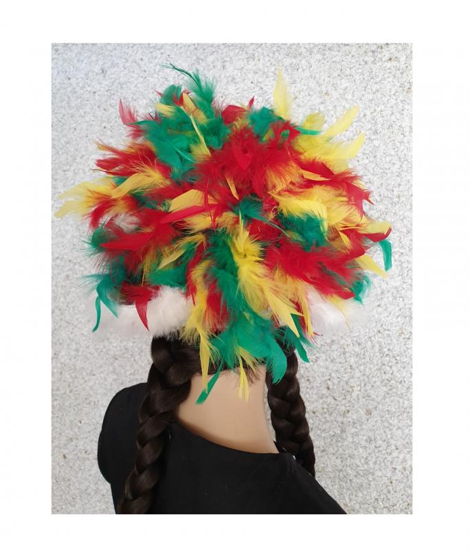 "Funkenhut weiß mit Silberborte,Marabu weiß und rot-grün-gelb Regenbogen Boa".