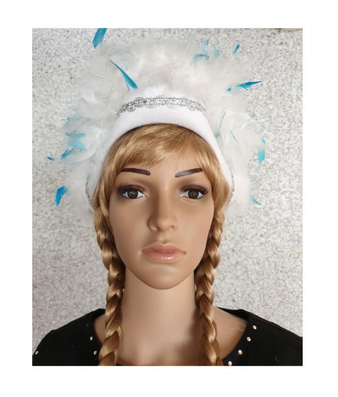 "Funkenhut weiß mit Silberborte,Marabu weiß und türkis-weißer Boa".