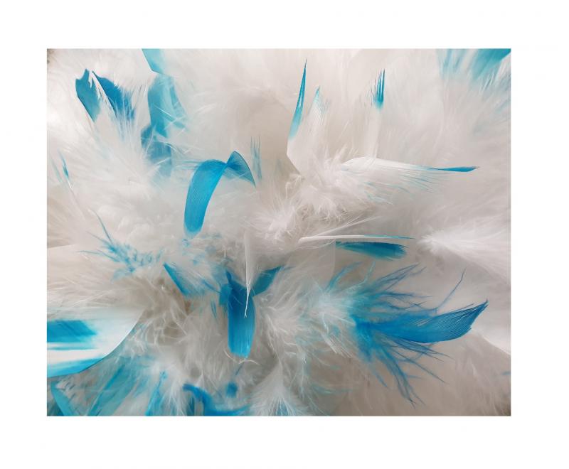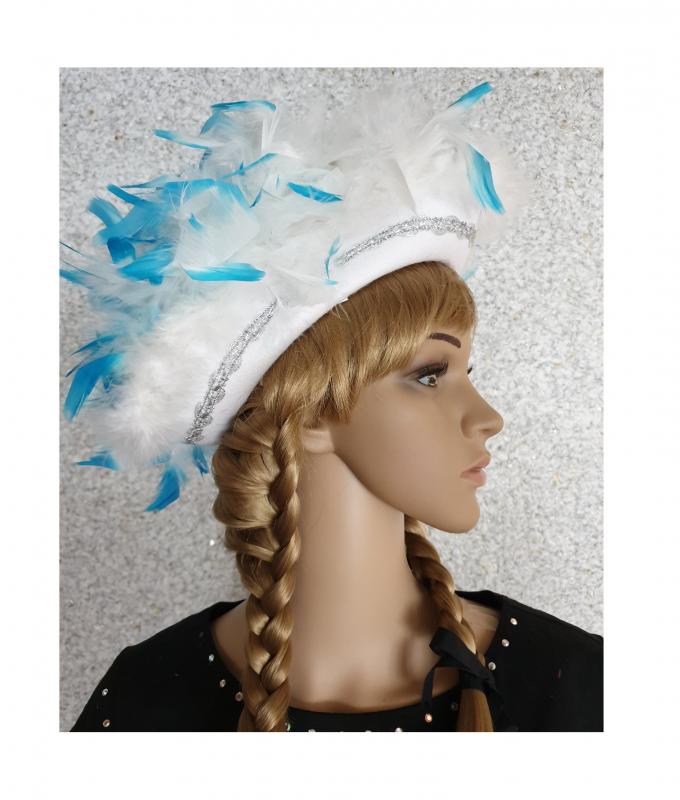 "Funkenhut weiß mit Silberborte,Marabu weiß und türkis-weißer Boa".