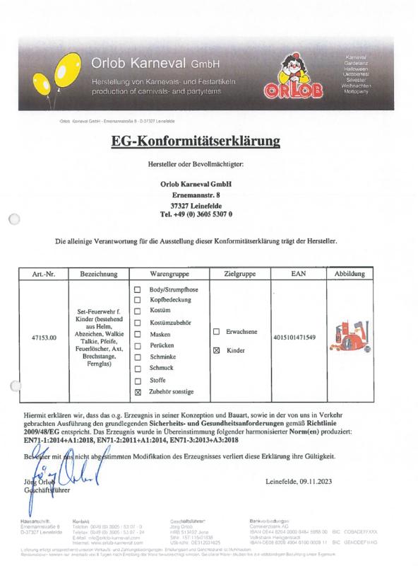 Set Neu,Material 100 % Kunststoff mit Etikett, in 1 Größe erhältlich. Sehr gute Qualität.Set besteht aus 8 Teile:Helm, Abzeichen, Walkie Talkie, Pfeife, Feuerlöscher, Axt, Brechstange, Fernglas ohne Kostüm und Schuhe.