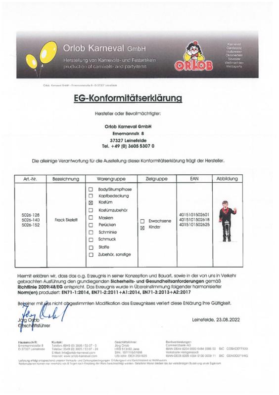 Kostüm besteht aus 2 Teile: Frack und Overall mit aufgedrucktem Skelett ohne weiteres Zubehör.