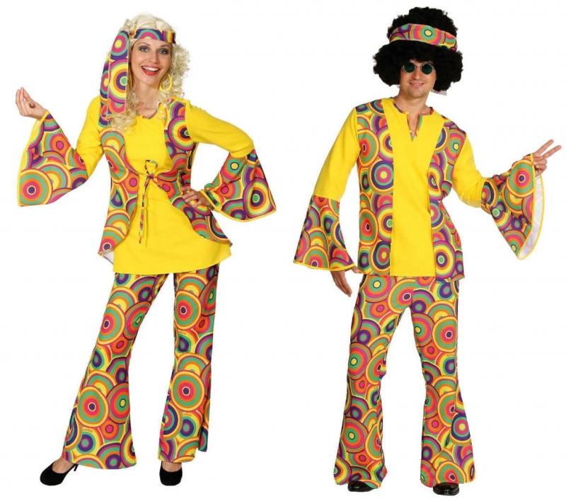 Das Flower-Dream Kostüm besteht aus einer bunten, ausgestellten Hose. Ausgestattet ist diese mit einer Hosentasche und einem Gummizug im Bund. Das Oberteil ist gelb mit langem Arm und bunten, weiten Teller-Armen. Das Shirt besitzt ein aufgenähtes, buntes Westen-Teil im vorderen Bereich.