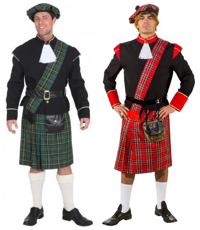 ein weißes Jabot, eine rot-karierte Schärpe und einen schwarzen Kunstleder-Gürtel. Inklusive Schotten-Mütze mit Bommel.