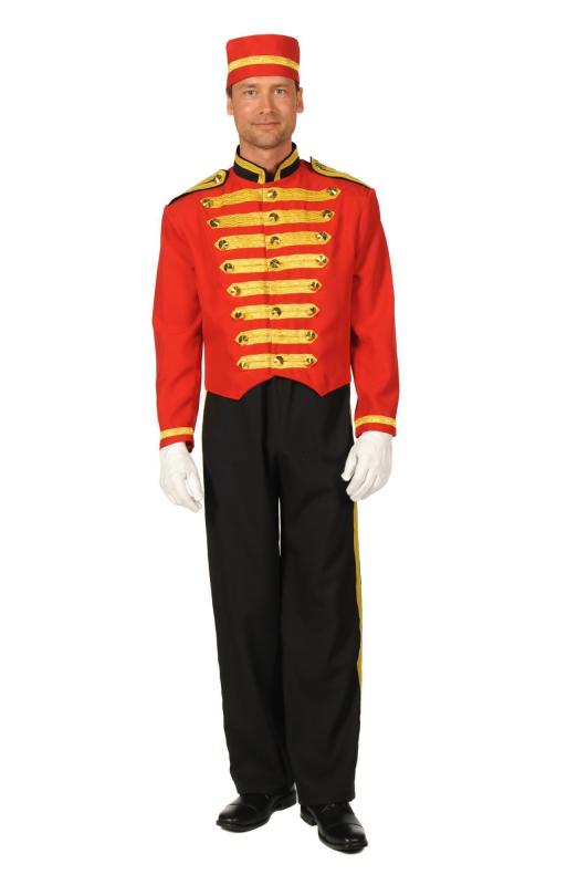 Kostüm bestehend aus einer Jacke mit Knöpfen,einer Hose mit seitlichem Zierstreifen und einer Mütze.
