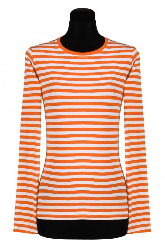 Damen Ringelshirt langarm-tailliert, orange-weiß.
