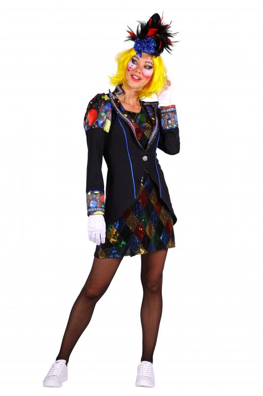 Damen Clown Jacke und Trägerkleid, schwarz-bunt.