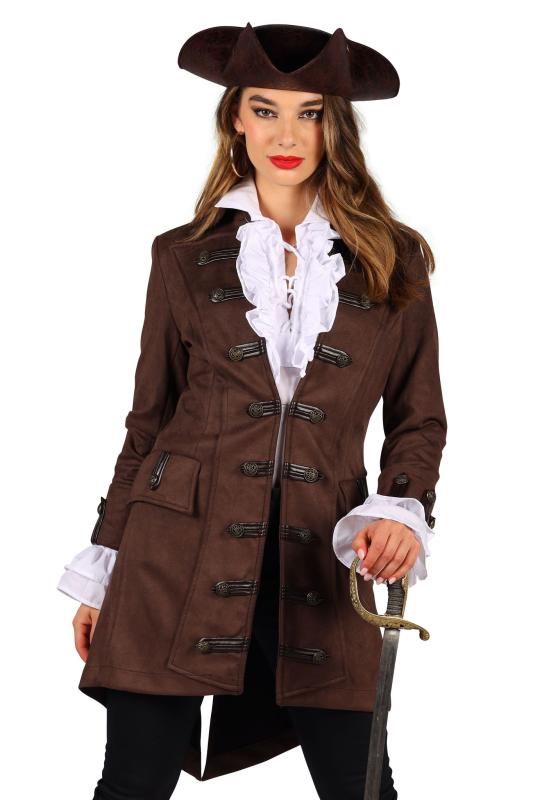 Damen Kostüm besteht aus einer langen,ausgestellten Jacke mit bronxefarbenden Knöpfen.