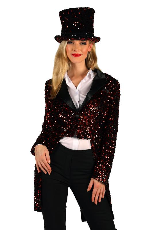Damen Pailletten Frack-Jacke mit schwarzen Kragen und vielen roten runden Pailletten.