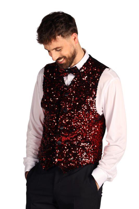 Herren Pailletten Weste mit schwarzen Kragen und vielen roten runden Pailletten.